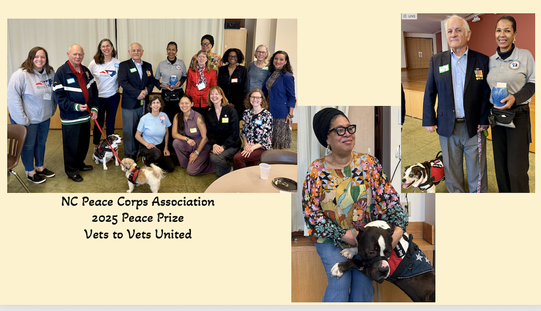 We were thrilled to honor Vets to Vets United with the 2025 NC Peace Prize on March 1 at Pullen Memorial Baptist Church. Dr. Terry Morris, DVM (founder and executive director), and Dan Portaro (board member and Vietnam veteran) shared inspirational stories of Vets to Vets United’s impact on our community. They generously fielded questions from an engaged groups of about 30 RPCVs and guests. We loved meeting and learning from the veterans and rescue dogs who joined us on this special day.