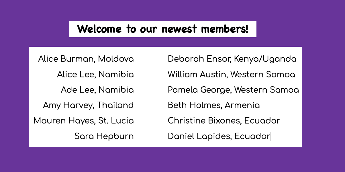 Contact NCPCA President Jennifer Chow, RPCV/Mongolia at [email protected]om, or Vice President Ruth Heuer, RPCV/Philippines at [email protected]. For news, updates and newsletter suggestions, contact our communications team. Sara Boro, RPCV/Guatemala, handles our website. Kate Gavaghan, RPCV/Botswana, produces this newsletter. Carol Myint, RPCV/Thailand, manages the Instagram and Facebook accounts. You can contact any of them at [email protected].